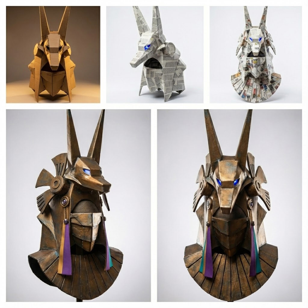 I’ve loved the movie Stargate since I was a kid, so I challenged myself to build a costume of one of my favorite characters using everyday materials: cardboard and paper mâché. From patterning and sculpting to reinforcement and hand painting, this labor of love won me a Halloween costume contest in 2016 and still sits on its mannequin today.