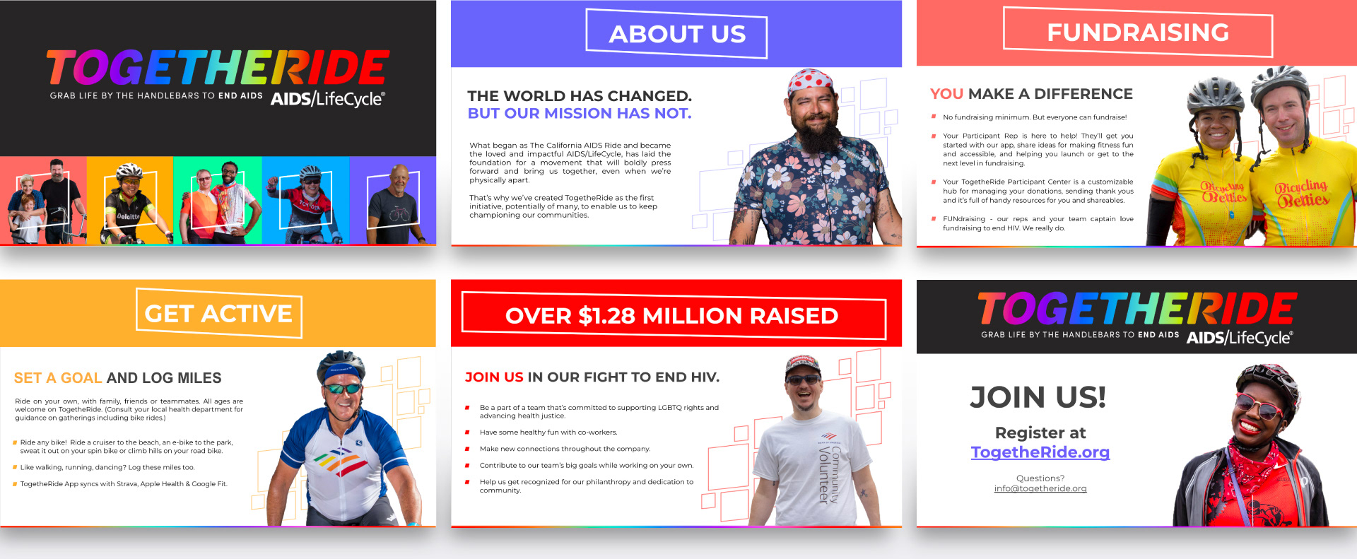 During COVID-19, AIDS/LifeCycle launched TogetheRide—a community-wide fitness and fundraising challenge designed to create connection even while physically apart. Training and fundraising became gamified with an app, milestone badges, and incentives iterated on by an established visual identity.