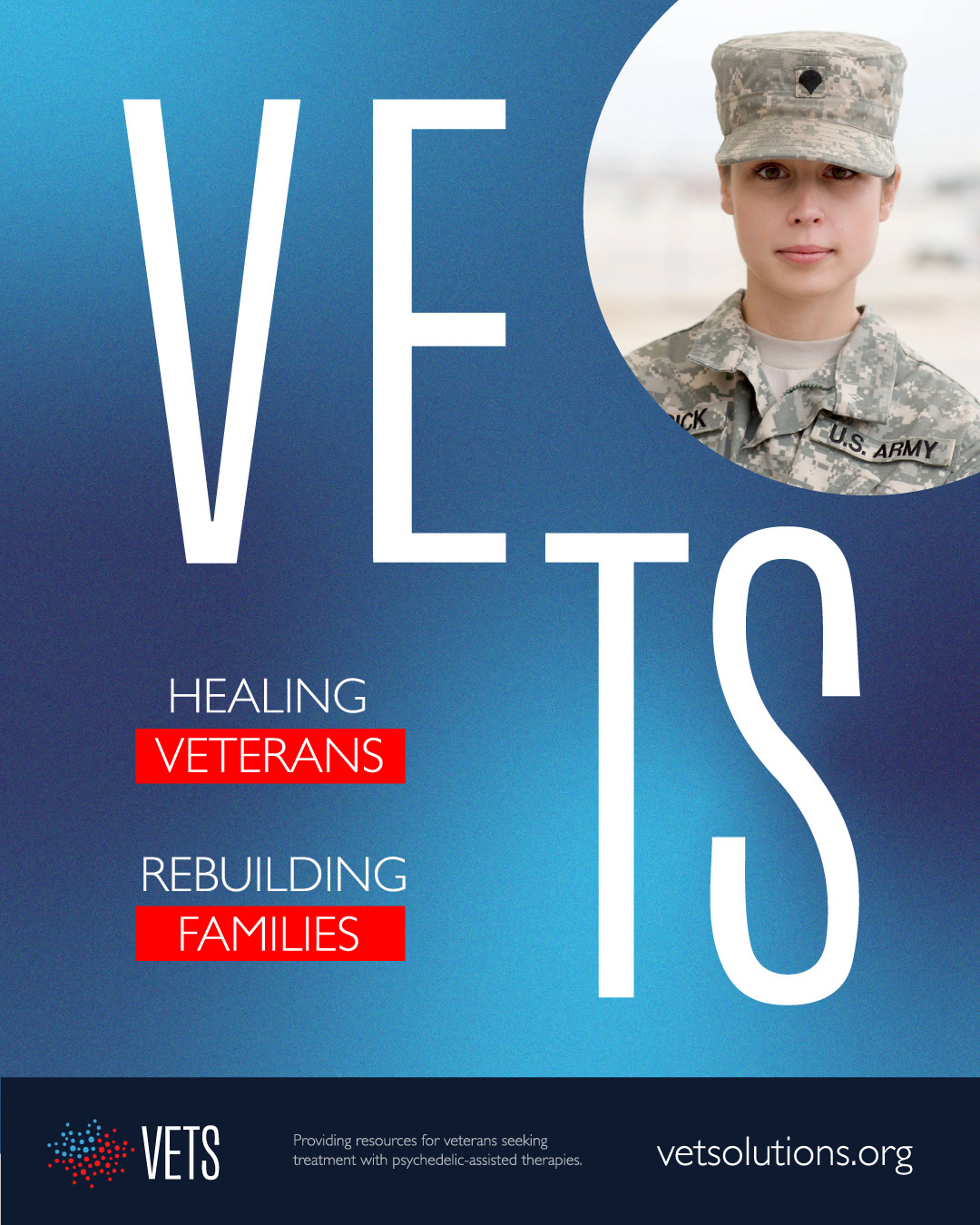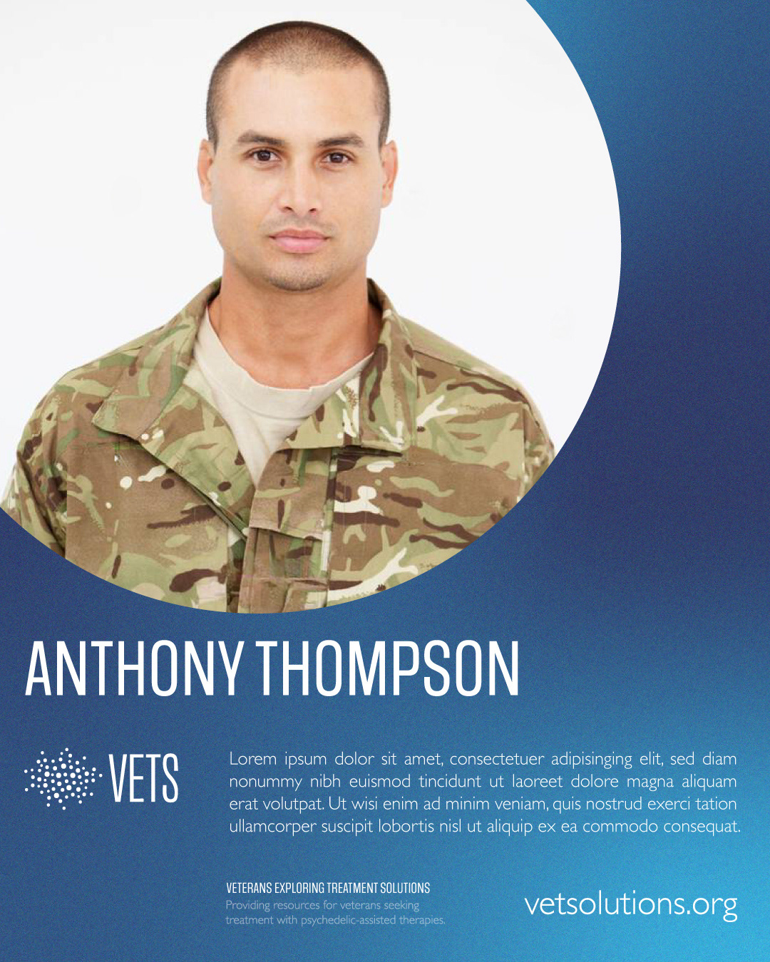 Concept visual identity for the Veterans Exploring Treatment Solutions (VETS) non-profit, providing resources for veterans seeking psychedelic-assisted therapies. Print and digital asset templates include: testimonials, social shares, carousels, and recruitment posters.